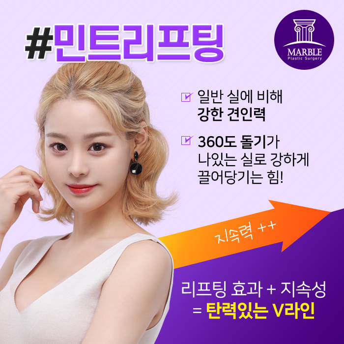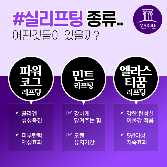 종류로는 민트실리프팅, 파워코그리프팅, 엘라스티꿈리프팅 등이 있으며, 그 가운데 엘라스티꿈리프팅은 일반실과 달리 부드럽고 탄력 있는 특수 소재의 밴드로 이루어져 있습니다.